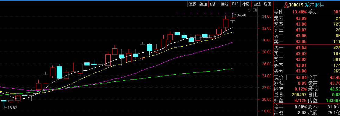 盘面上,爱尔眼科20日收报于43.04元,涨0.12%,2020年开年至今累积上涨8.8%,2019年全年大涨97%。